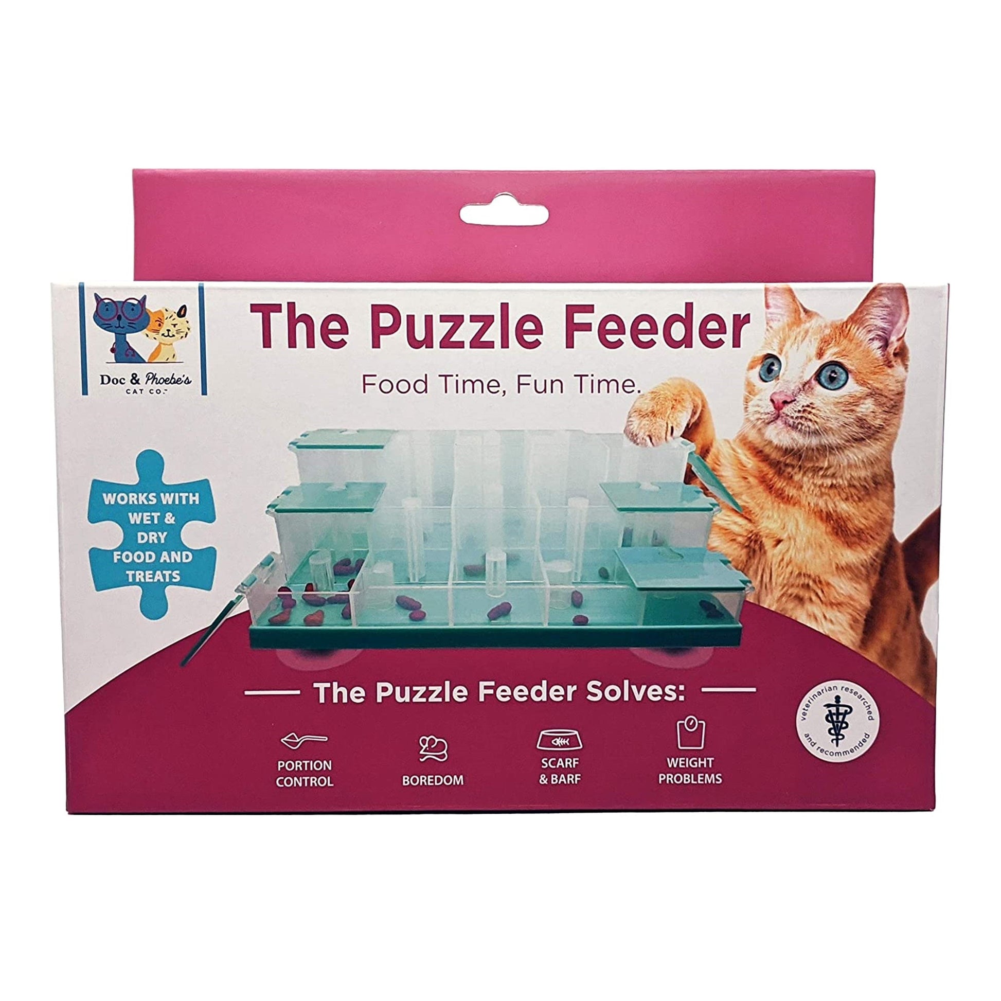 The puzzle feeder has multiple levels of challenge for cats. Nine compartments with open tops and 6 with flip top lids. Place food or treats in various compartments and see how smart kitty is opening the tops and finding treats. Suction feet to hold the puzzle feeder in place. Veterinarian developed and approved.