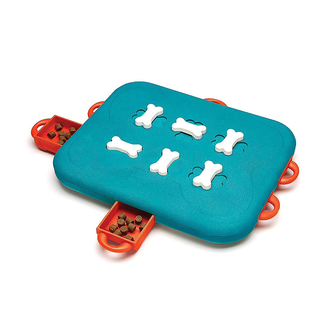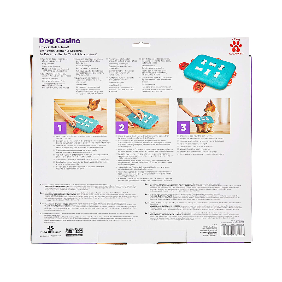 The Dog Casino interactive treat puzzle is a level 3 advanced dog game from Nina Ottosson by Outward Hound that's ideal for bored dogs! This interactive dog puzzle features six treat drawers for dog treats which can be accessed by twisting the bone locks. Just simply place the treats in the drawers, slide them in, and twist the bones for an added sequential step challenge. Your pup will enjoy pawing, sniffing, and nudging around to reveal the hidden tasty rewards! The Dog Casino interactive puzzle dog toy is made of safe and durable BPA, PVC & phthalate-free material. Easy to clean with warm water and soap between uses.