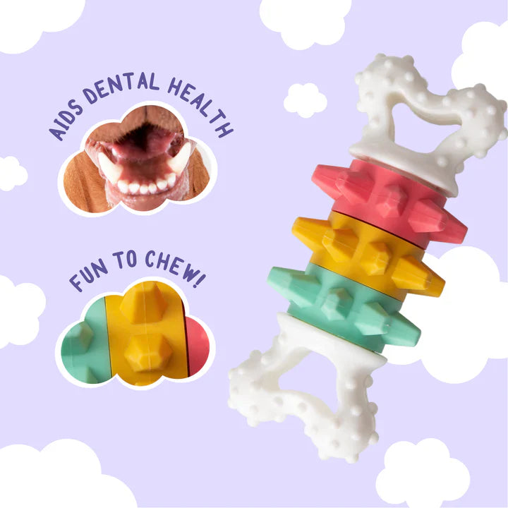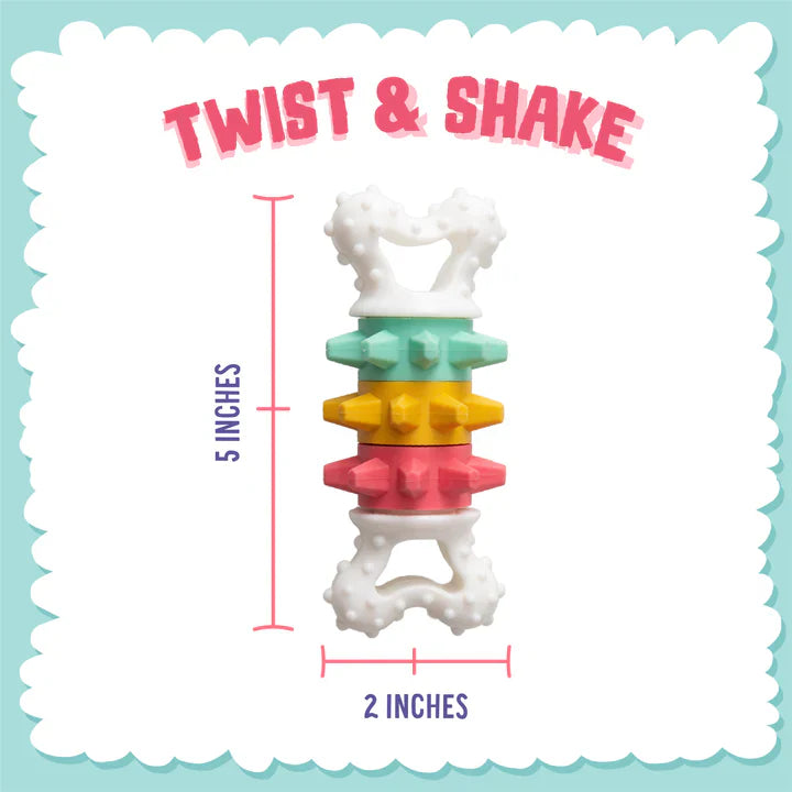 Give your pup an enriching vintage playtime experience with this interactive Twist & Shake Dog Bone Toy! This extra durable toy features a nubby and spikey texture, three vibrant colors, and twistable rings that create a unique sound when shaken. It's the perfect way to keep even those hearty chewers entertained for hours - all while being eco-friendly in construction! 6" toy.
