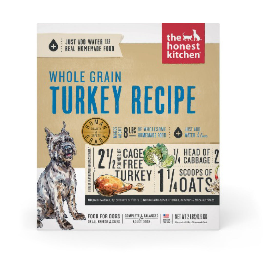 Give your pup a taste of Thanksgiving all year round with The Honest Kitchen Whole Grain Turkey Recipe Dehydrated Dog Food! This dehydrated dog food is made with cage-free turkey, organic whole oats and simple garden produce.